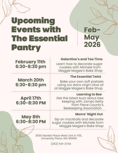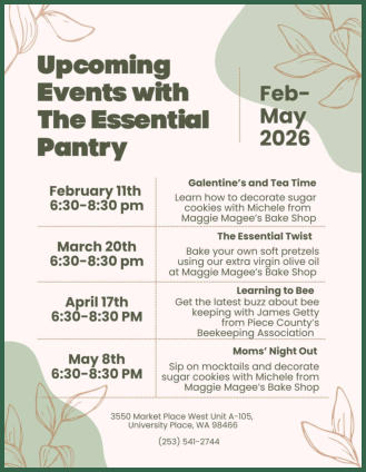 Special events at The Essential Pantry bring people together around creativity, good food, and shared experiences. Each gathering feels like a chance to slow down and enjoy something hands‑on, whether it’s decorating cookies, twisting soft pretzels, or learning about the magic of local bees. The atmosphere is relaxed and friendly, with plenty of laughter and little moments of discovery.Partnering with local makers like Maggie Magee’s Bake Shop and the regional beekeeping community adds a personal touch to every workshop. Guests don’t just learn a skill; they connect with the people behind it. By the time spring rolls into early summer, these events start to feel like a familiar ritual, something to look forward to, a place where creativity and community meet.You can DM us on Instagram or Facebook or call us (253) 541-2744 to let us know you’re coming.