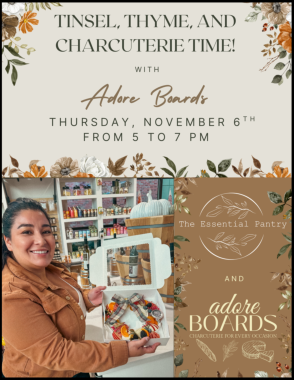 Join us at The Essential Pantry on Thursday, November 6th from 5 to 7PM.We would love to see you there!We are so pleased to share that The Essential Pantry will be hosting a charcuterie class with Doreen Arguela of Adore Boards.